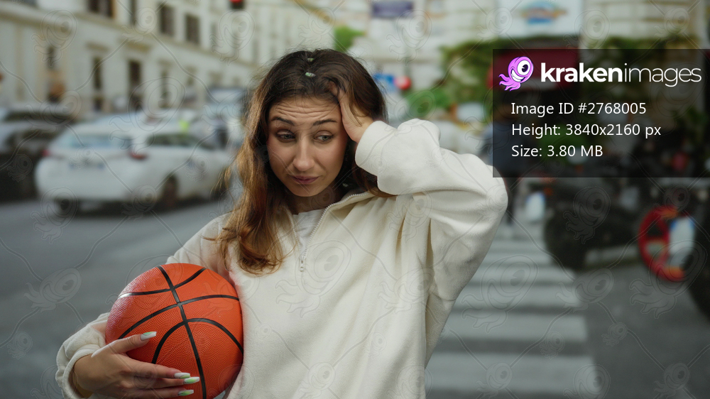 Woman holding basketball on city street looking frustrated with cars and buildings in the background during daytime