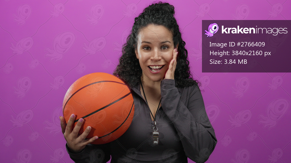 Woman holding basketball smiling isolated on vibrant pink background wearing dark jacket capturing energetic emotion youthful spirit and sports enthusiasm