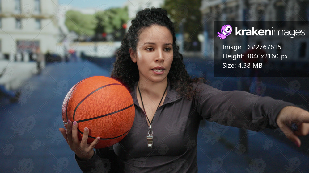 Woman holding basketball standing on urban street pointing outdoors in daytime wearing gray jacket with curly hair captured in lively hispanic environment. - Kraken Images