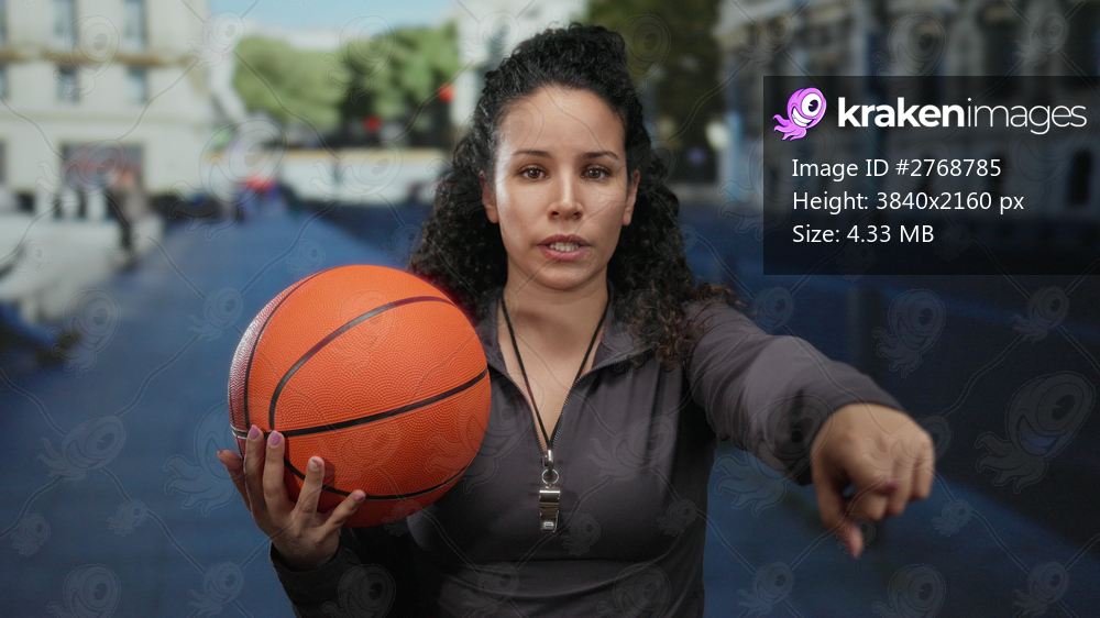 Woman holding basketball standing on urban street pointing outdoors in daytime wearing gray jacket with curly hair captured in lively hispanic environment. - Kraken Images