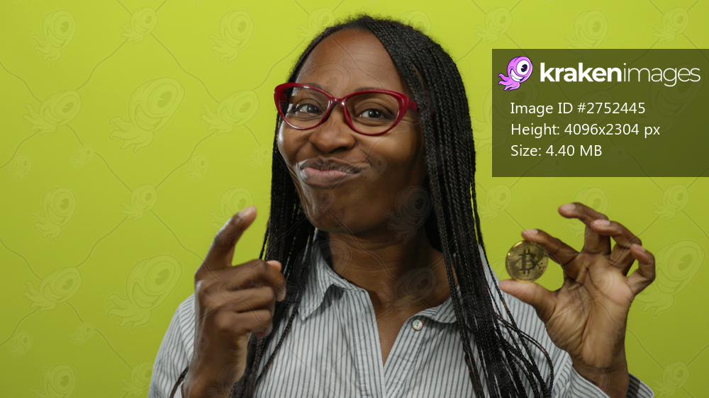 Woman holding bitcoin excitedly against isolated yellow background representing cryptocurrency investment opportunity.