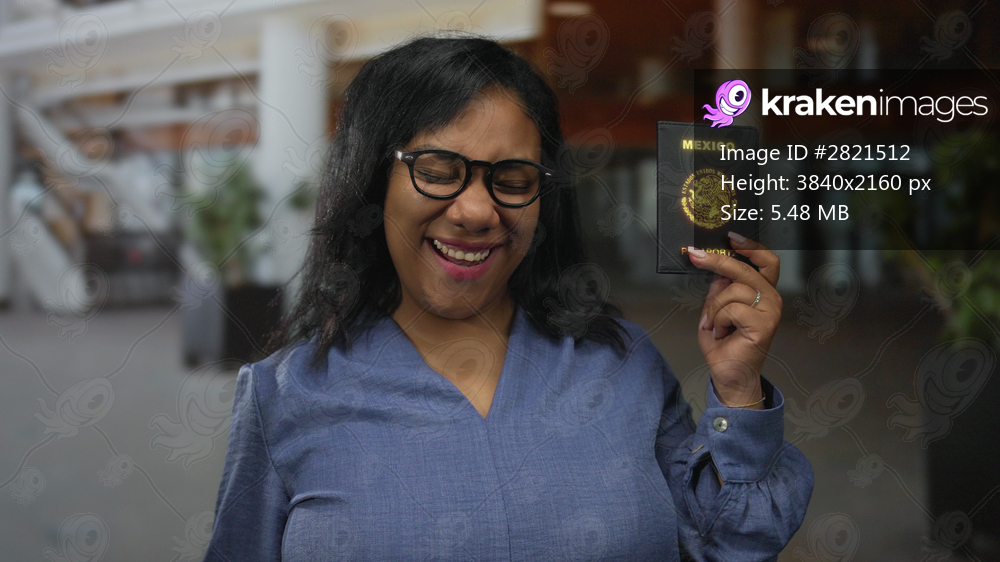 Woman holding black mexican passport and flashing rock horns in airport lobby; travel identity pride.