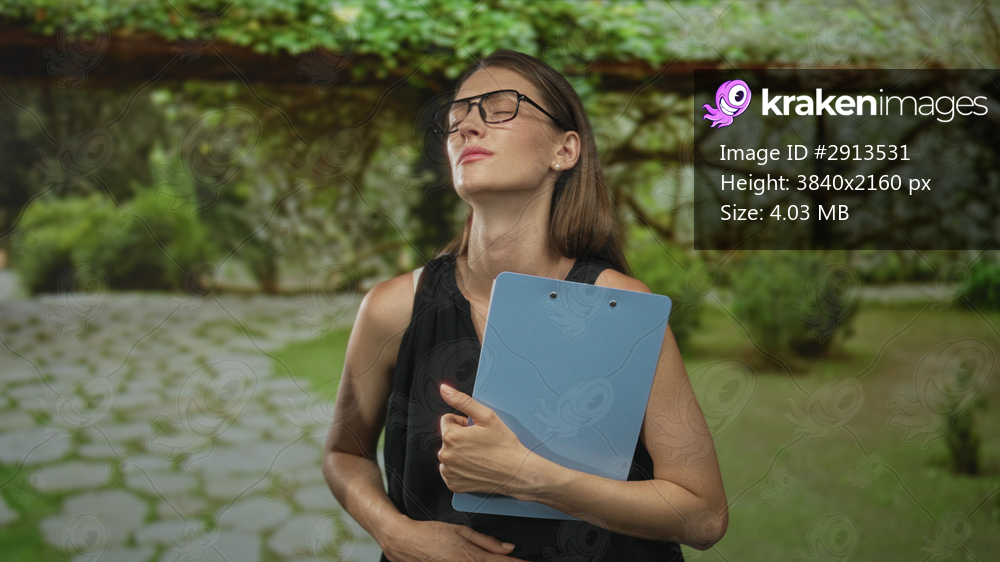 Woman holding blue clipboard and clutching it to her chest, glasses on, squints and looks up in forest path setting; contemplation focus.
