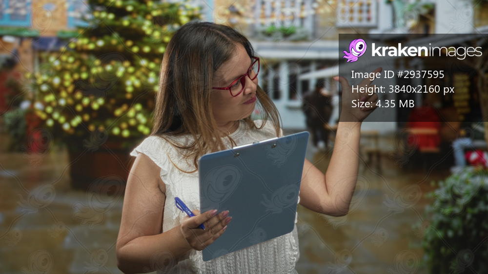 Woman holding blue clipboard and pen points finger on wet street by lit christmas tree and market stalls; festive planning.