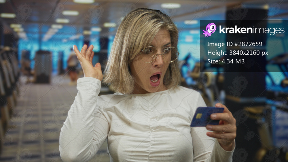 Woman holding blue creditcard and hand to head in gym building with eyes closed and rows of treadmills visible; financial stress.