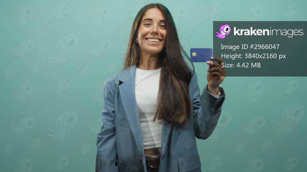 Woman holding blue creditcard up with concerned expression, presenting the card in studio wearing blue blazer and white top; financial anxiety.