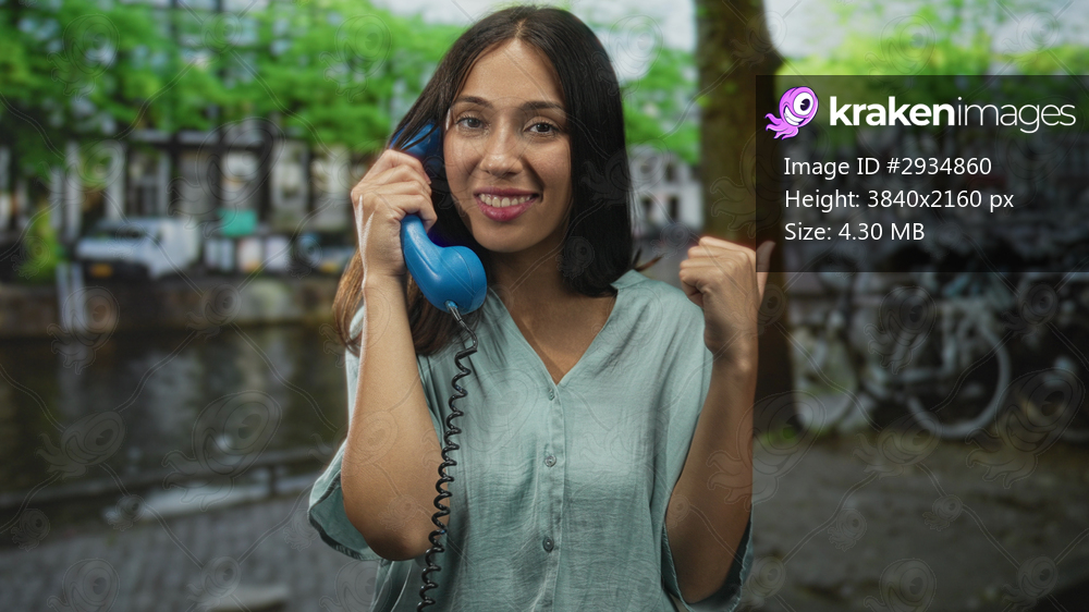 Woman holding blue handset to ear with thumb pointing toward street bicycles by canal in amsterdam; cheerful connection.