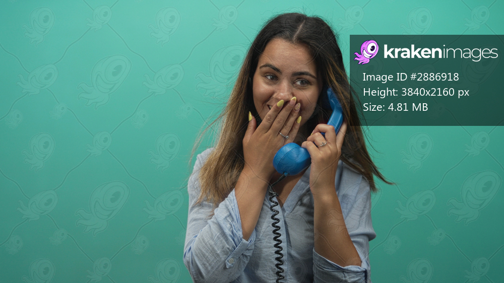 Woman holding blue handset to ear while covering mouth in studio with teal green background; surprise conversation.
