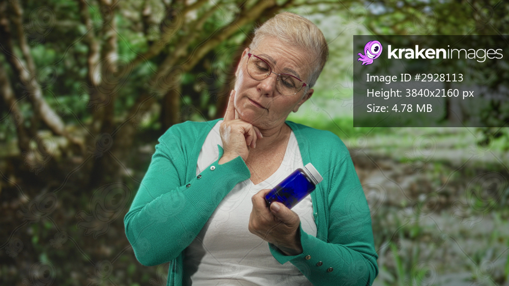 Woman holding blue medicine bottle with hand on chin in forest wearing teal cardigan and glasses; concern about medication.