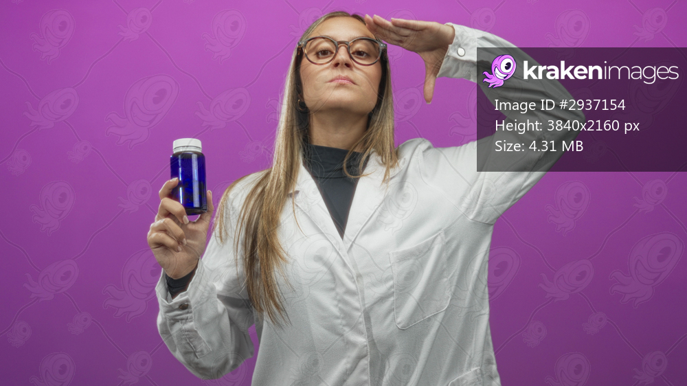 Woman holding blue medicine bottle and shading forehead with hand in studio; confidence wellness research.
