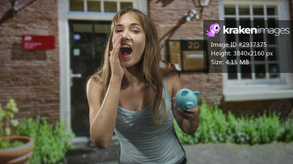 Woman holding blue piggybank and cupping hand to mouth while smiling at a building entrance with number plaque visible; saving optimism.