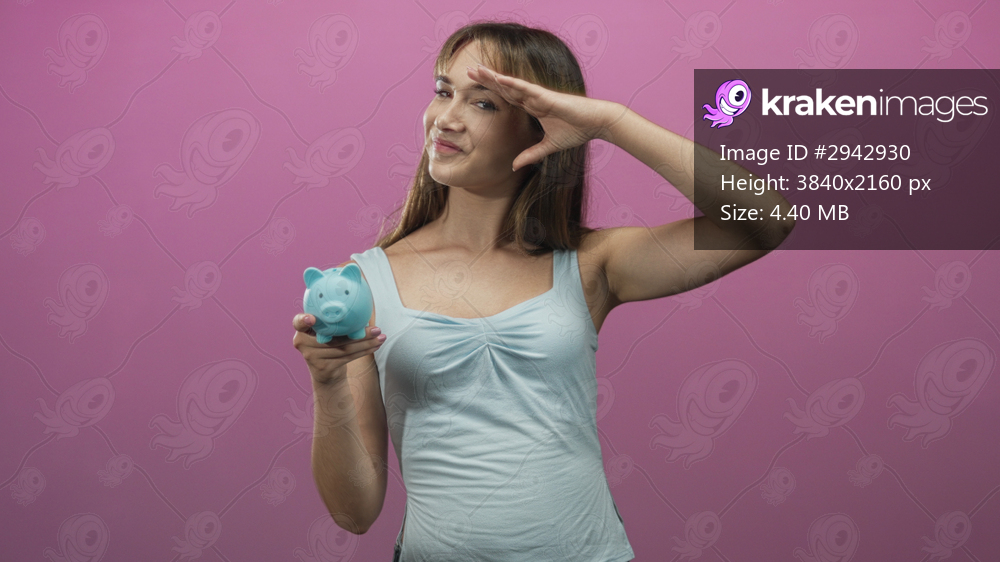 Woman holding blue piggybank with outstretched arm, wearing light blue tank top and smiling in pink studio; cheerful saving habit.