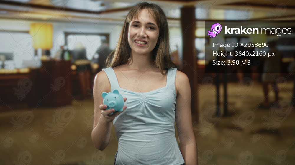 Woman holding blue piggybank with outstretched hand in hotel building lobby wearing light blue tank top; saving money optimism.