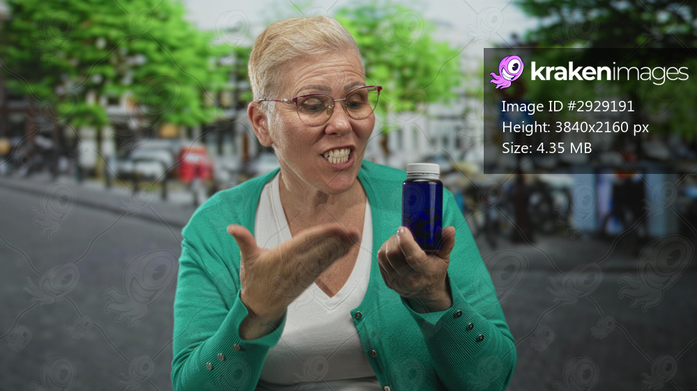 Woman holding blue pill bottle and gesturing with hand on busy city street; curiosity decision wellness.