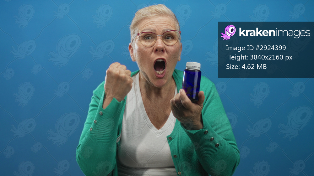 Woman holding blue pill bottle with open mouth and clenched fist, wearing green cardigan and glasses in studio; excitement health benefit.