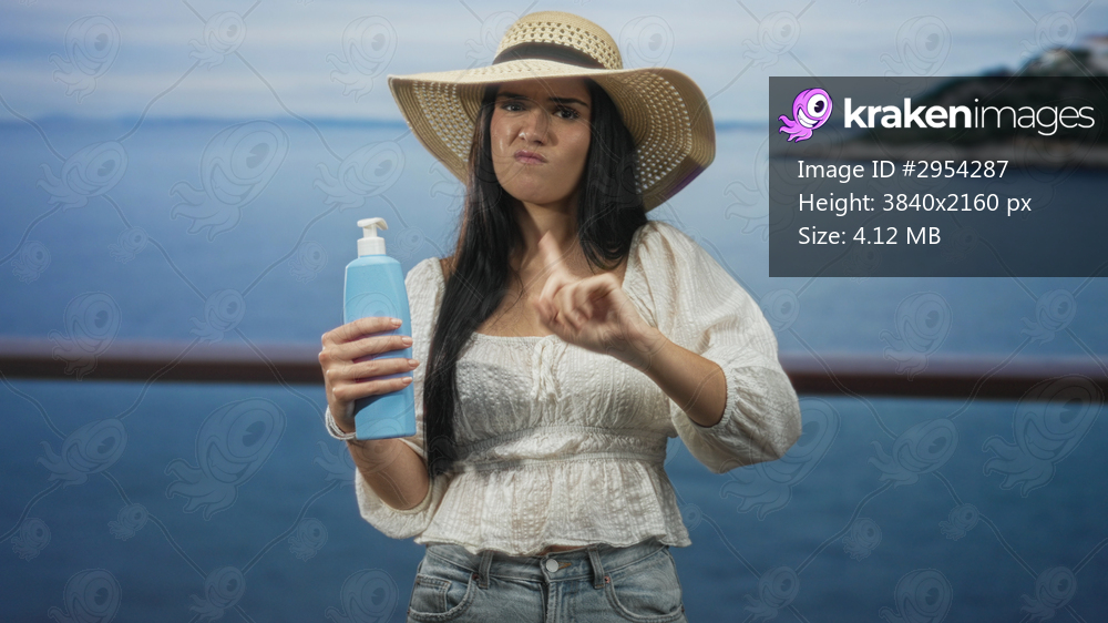 Woman holding blue sunscreen bottle points finger upward on boat deck by sea wearing straw hat and white top; sun protection caution.