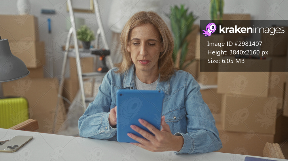 Woman holding blue tablet with hands at table in studio, surrounded by cardboard boxes, ladder, suitcase and lamp; planning calm.