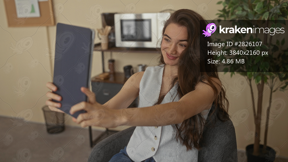 Woman holding blue tablet smiles and touches long hair while seated in building; digital social connection joy.