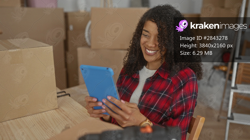 Woman holding blue tablet smiles while reading messages at a wooden desk surrounded by cardboard boxes in an office building; happiness productivity.