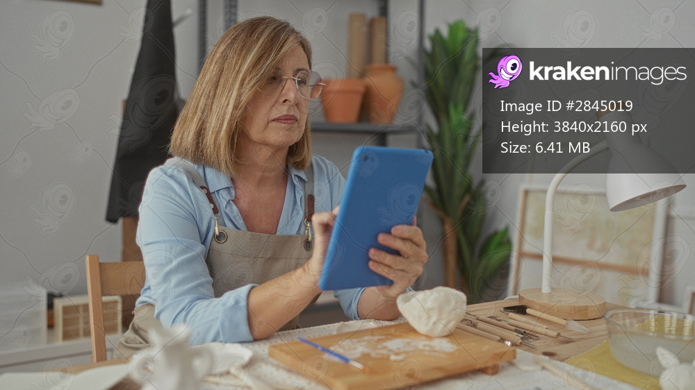 Woman holding blue tablet while tapping touchscreen at pottery studio desk with clay tools and lamp; calm creative concentration.