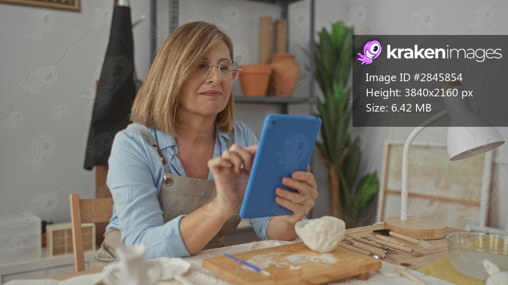 Woman holding blue tablet while tapping touchscreen at pottery studio desk with clay tools and lamp; calm creative concentration.
