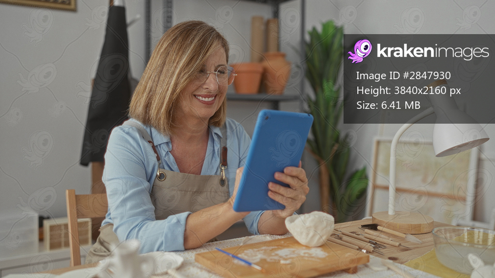 Woman holding blue tablet while tapping touchscreen at pottery studio desk with clay tools and lamp; calm creative concentration.