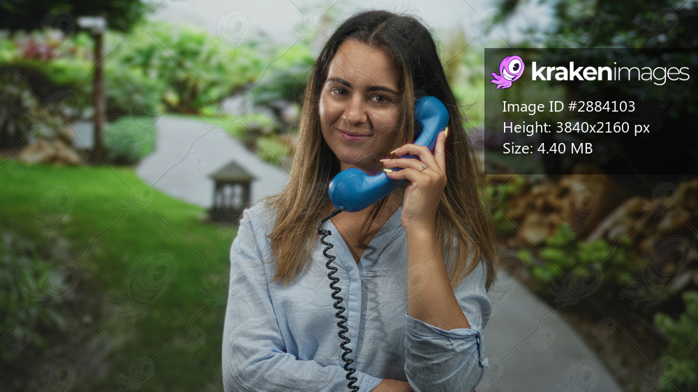 Woman holding blue telephone handset to ear, smiling with eyes closed, wearing light blue shirt in forest; contentment.