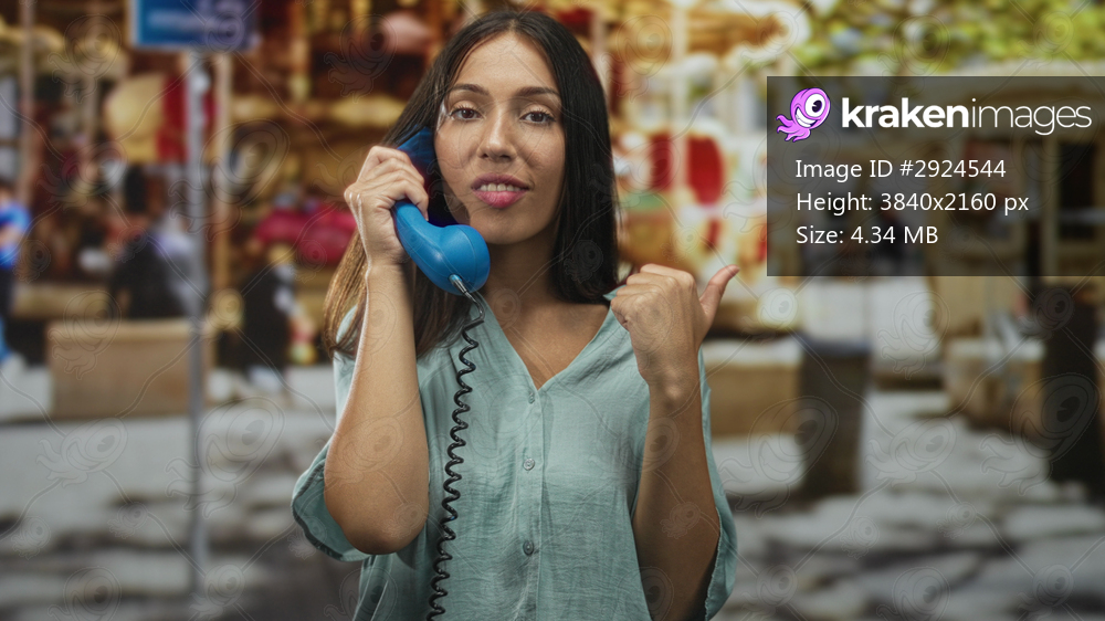 Woman holding blue telephone handset to ear and thumb pointing over shoulder on street; cheerful communication.