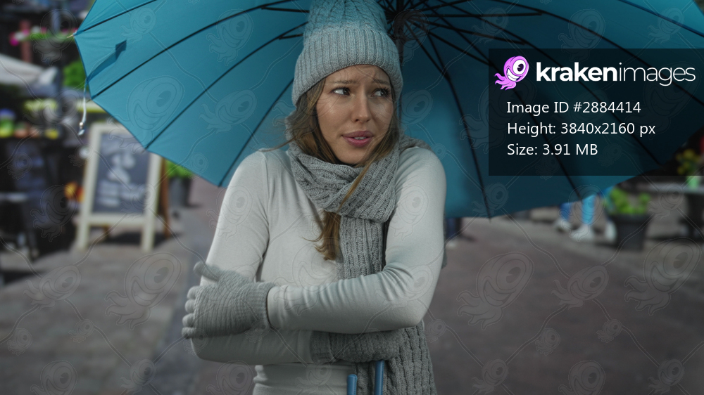 Woman holding blue umbrella and hugging herself, shivering on street market pavement; wet cold discomfort.