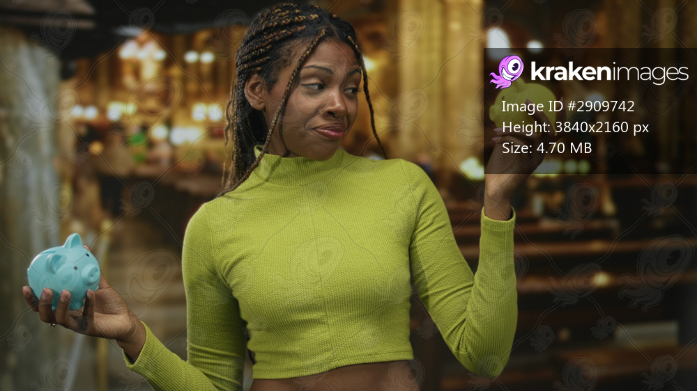 Woman holding blue and yellow piggybank in each hand in a church building, brow furrowed while comparing savings choices; financial uncertainty.