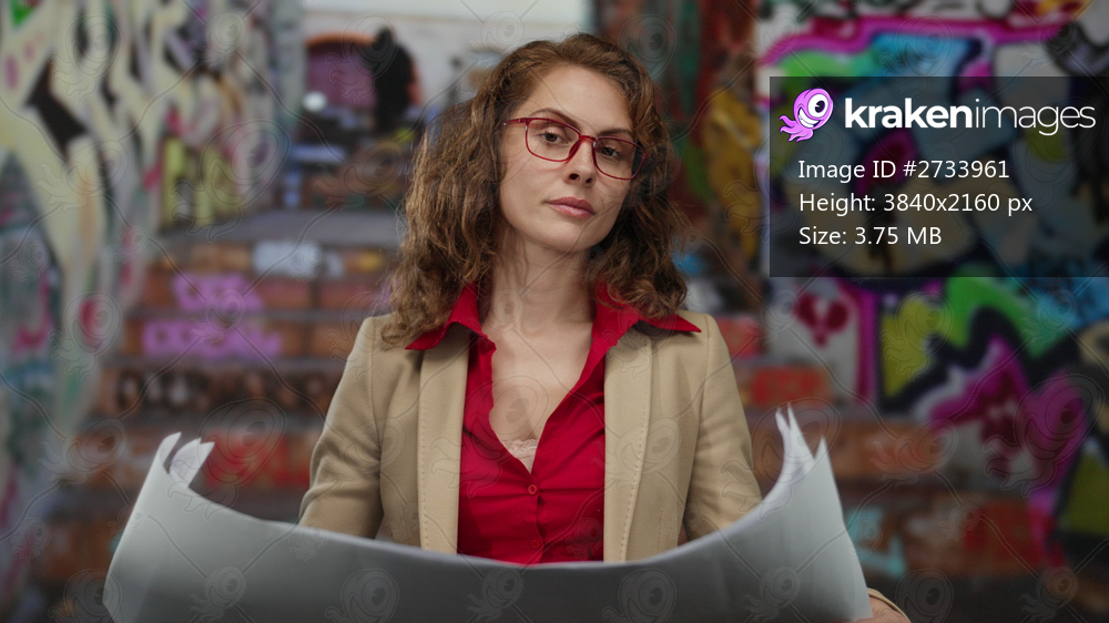Woman holding blueprint and standing on graffiti-covered stairs in urban area, exuding confidence and focus.