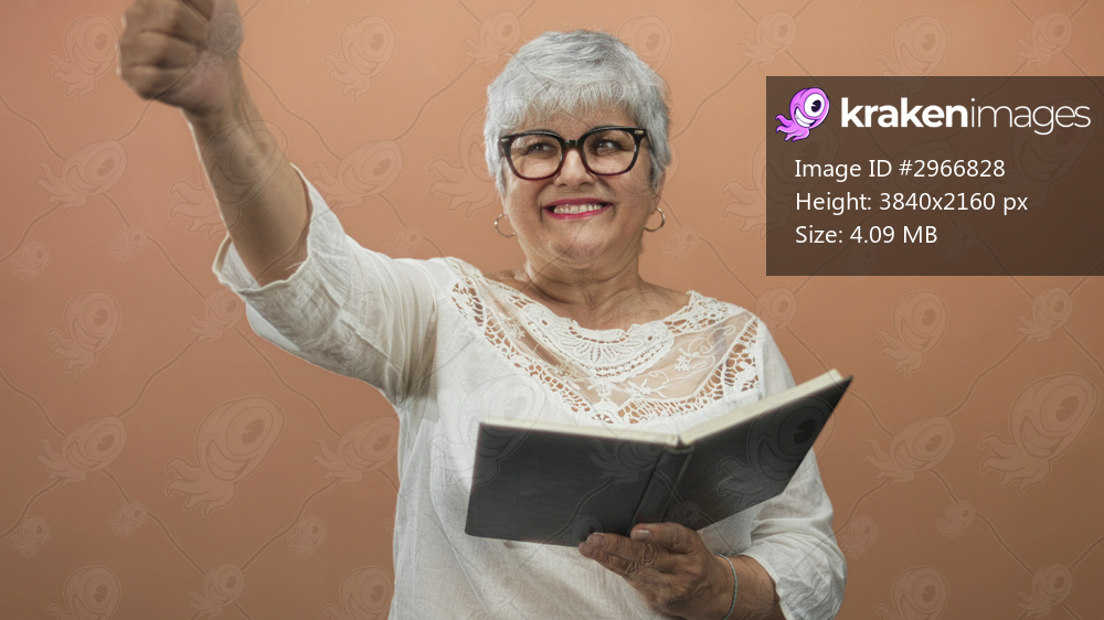 Woman holding book gives thumbs up while smiling and raising her arm in studio with a peach wall behind; confidence encouragement.