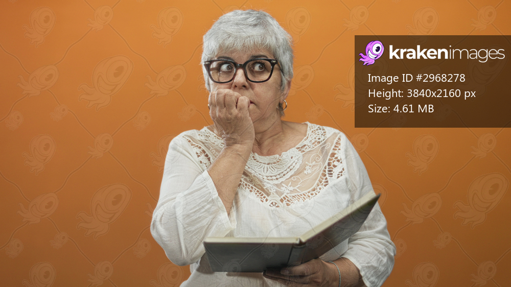 Woman holding book and looking up, hand to mouth gesture while reading in a studio with orange wall; concern reflection.