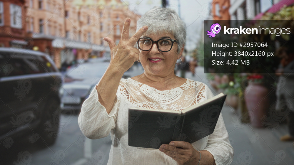 Woman holding book and pointing finger to temple on a busy urban street near cars and storefronts while reading from a hardcover notebook; confidence wisdom reflection. - Kraken Images