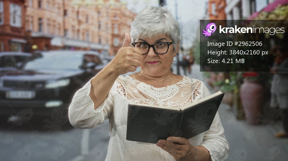 Woman holding book and pointing finger to temple on a busy urban street near cars and storefronts while reading from a hardcover notebook; confidence wisdom reflection. - Kraken Images