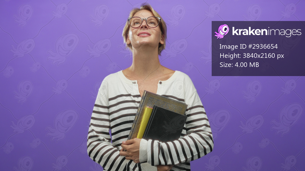 Woman holding books, arms hugging a stack and hands clasped while looking upward against purple studio backdrop; contentment study focus.
