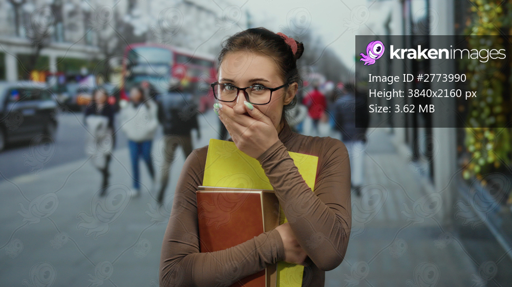 Woman holding books and covering face stands on bustling city street, wearing glasses and hair tie, suggesting thoughtfulness in urban environment.