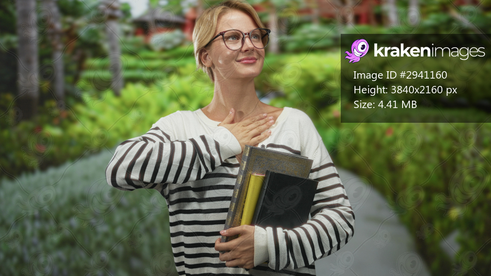 Woman holding books, hand on chest on a forest path wearing glasses and striped sweater; gratitude reflection.