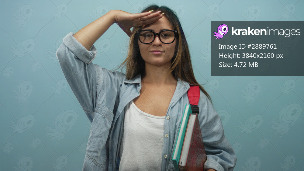 Woman holding books with hand to forehead salute in studio against light blue backdrop; confidence learning ambition.