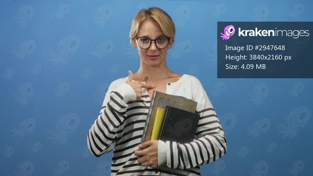 Woman holding books with thumbs up in studio blue backdrop wearing striped sweater and glasses; confidence learning optimism.