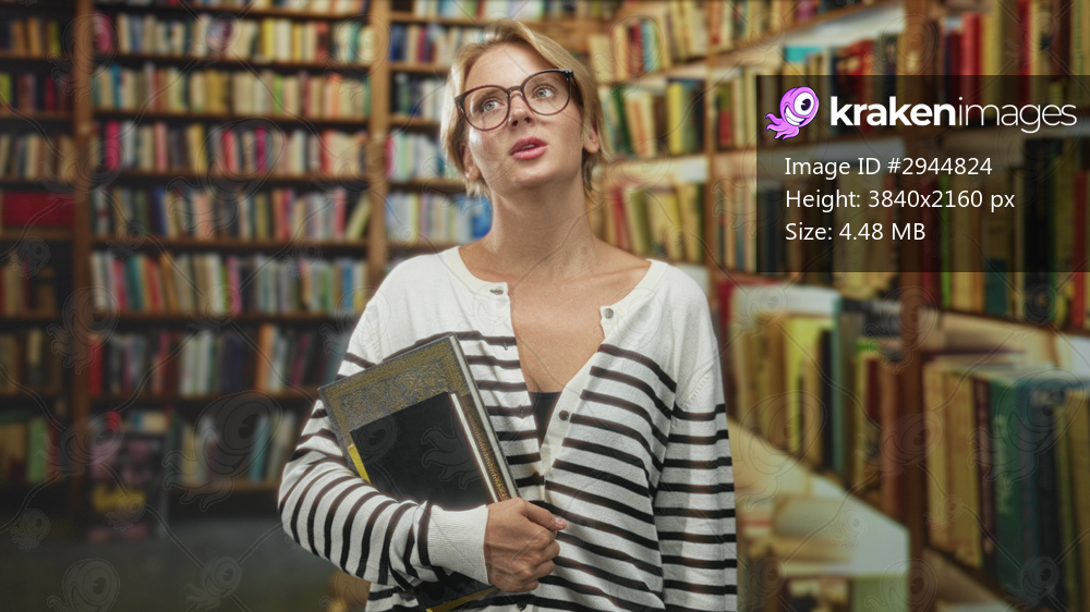 Woman holding books to chest in a building aisle lined with bookshelves, short blond hair wearing glasses; quiet contemplation.