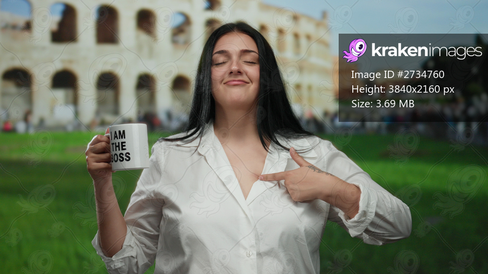 Woman holding boss mug in front of the roman colosseum in rome, wearing a white shirt and pointing at herself, conveying confidence in an outdoor urban setting with green grass. - Kraken Images