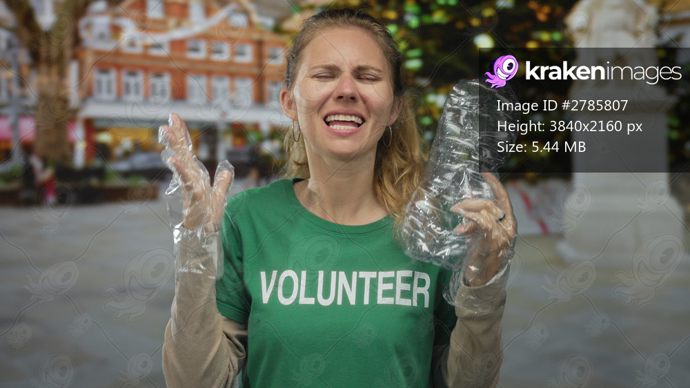 Woman holding bottle looks frustrated in a square as a blonde young volunteer wearing plastic gloves sorts recycling.