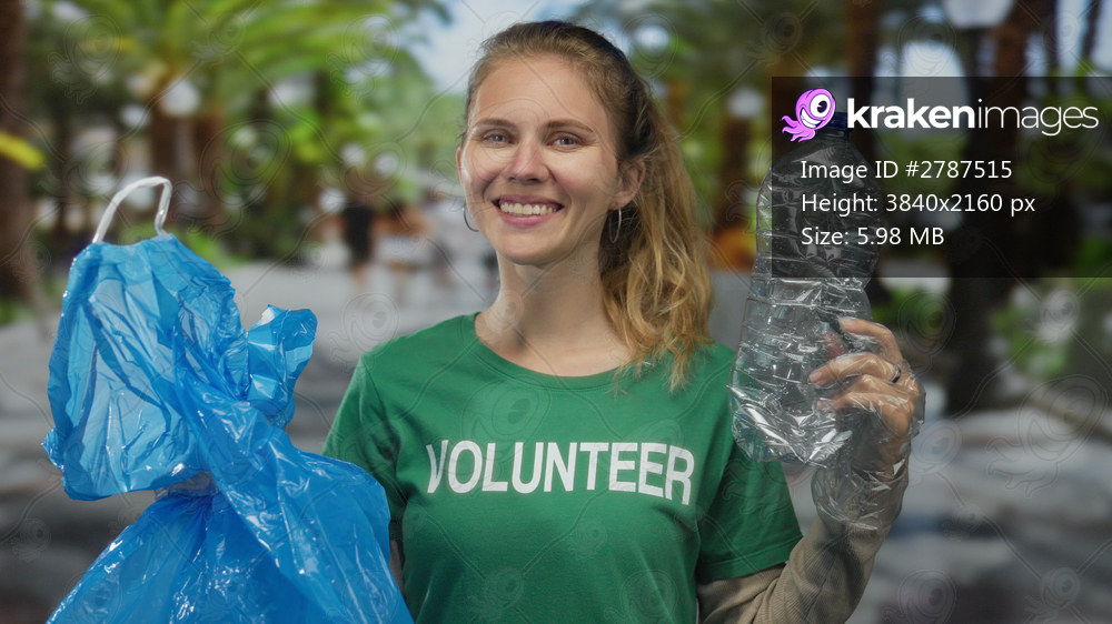 Woman holding bottle smiling in park as blonde young volunteer carries plastic bag with glove.