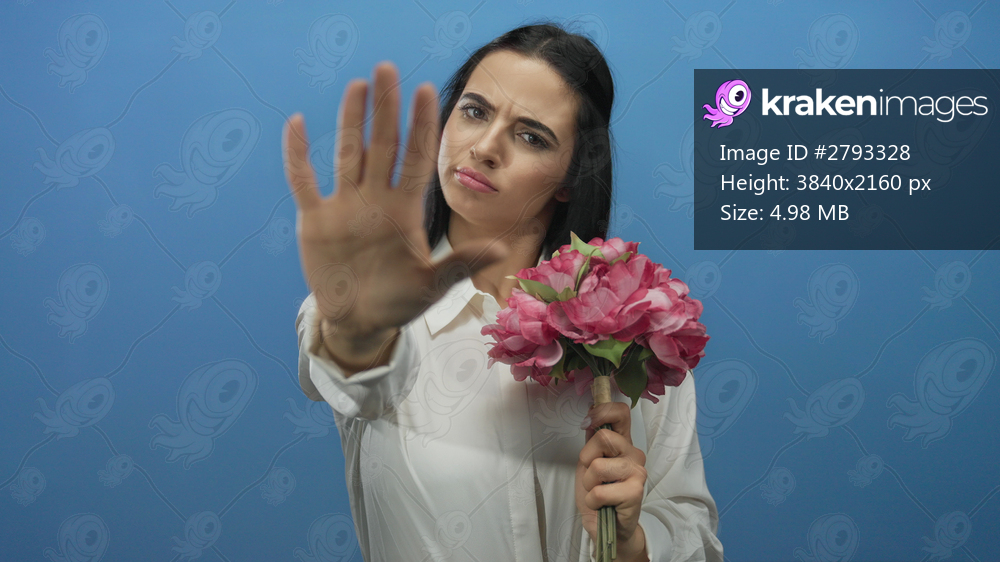 Woman holding bouquet against blue background expresses stop with hand gesture, featuring young hispanic female with flowers and a plain wall.