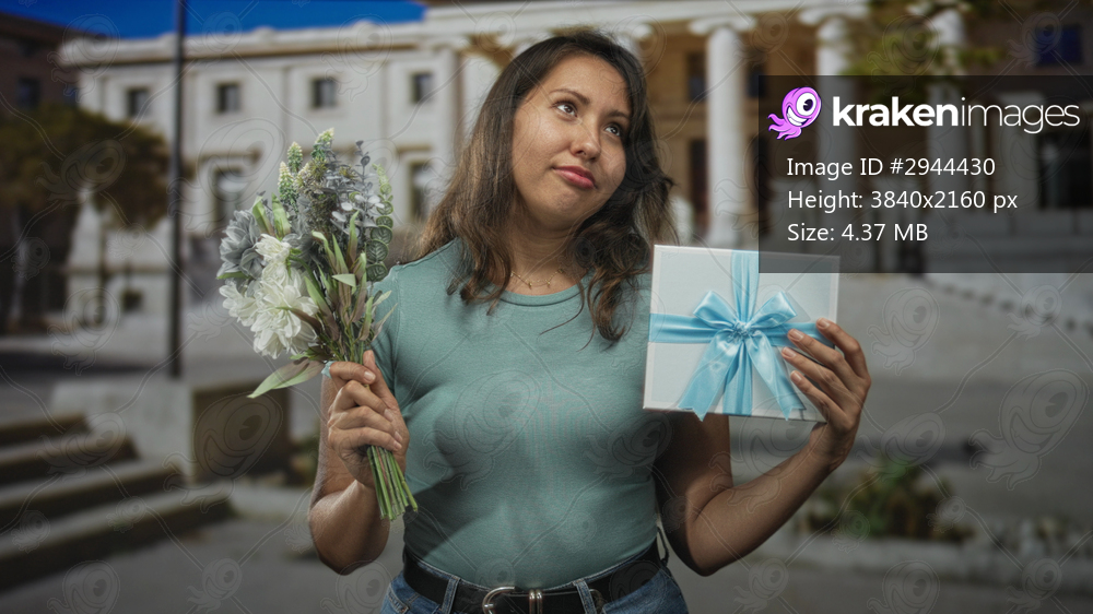 Woman holding bouquet and blue ribboned gift box in front of a classical building, smiling with eyes closed and wearing a teal top and jeans on stone steps; joy celebration. - Kraken Images
