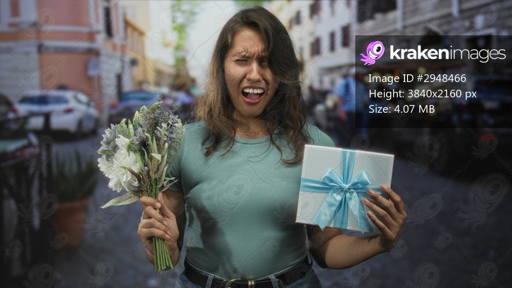 Woman holding bouquet and gift box with blue ribbon on city street, grimacing and raising gift toward camera; surprise celebration.