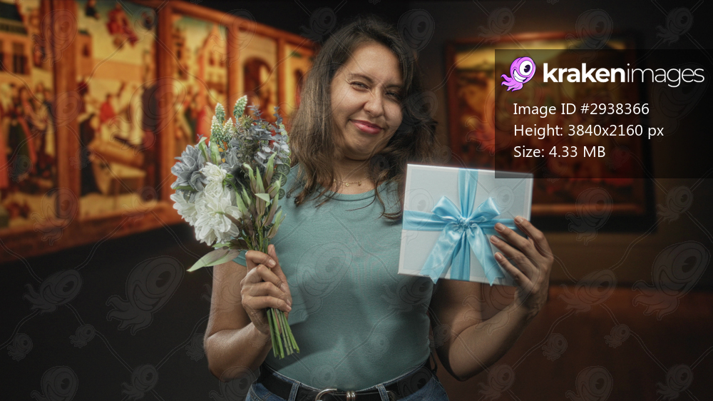 Woman holding bouquet and gift box with blue ribbon, smiling with closed eyes and turned head in gallery building; celebration joy gratitude.