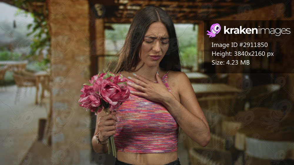 Woman holding bouquet with hand on chest at restaurant terrace indoors, grimacing and covering mouth; disgust regret.