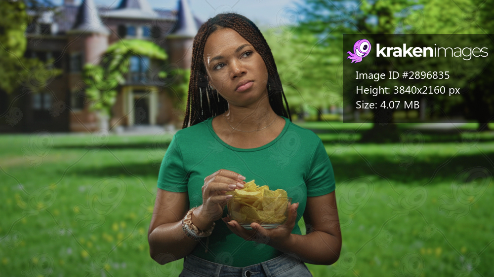 Woman holding bowl of chips chewing with eyes closed in front of building; serenity snacking leisure.